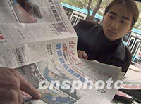 圖:北京市民關(guān)注國航客機(jī)墜機(jī)事件 2002年04月15日 16:50 ![]() 一位北京市民十五日下午正在街頭報(bào)亭購買當(dāng)日晚報(bào),了解中國國際航空公司一架波音767客機(jī)在韓國釜山機(jī)場(chǎng)附近墜毀的相關(guān)消息。中新社記者 張勤 攝