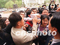 圖:在京媒體密切關注國航墜機事件 2002年04月15日 20:04 ![]() 15日,中國國航班機墜毀的消息傳出后,國航官員向守候在首都機場辦公樓外的各國媒體分發(fā)材料時,被團團圍住。中新社記者 鄭萍萍 攝