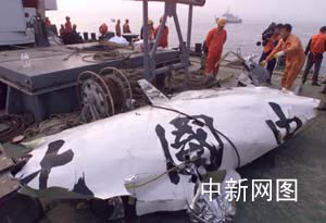 圖:又打撈起較大殘骸 “中國(guó)北”字樣清晰可見 2002年05月11日 21:54 ![]() “五-七”空難現(xiàn)場(chǎng)打撈部門今天又打撈出一塊較大的失事飛機(jī)殘骸,殘骸上“中國(guó)北”三個(gè)字清晰可見。(中新社記者王麗南攝)