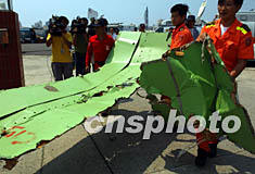 圖:打撈出的華航客機殘骸 2002年05月26日 16:24 ![]() 5月26日下午,搜索人員打撈出失事華航客機部分殘骸。中新社記者 任晨鳴 攝