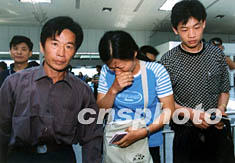 五月二十七日,“華航”空難罹難者林少清(女)的父親林國(guó)斌(左)、姐姐林少娟(中)、哥林少偉(右)在福建省臺(tái)辦官員的幫助下,首批登機(jī)赴臺(tái)奔喪。陳勇 攝