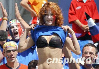 圖:法國瘋狂女球迷看臺(tái)上掀起上衣 2002年06月11日 14:38 ![]() 6月11日下午,韓日世界杯A組丹麥隊(duì)與法國隊(duì)的比賽在韓國仁川文鶴體育場進(jìn)行,圖為法國瘋狂女球迷看臺(tái)上掀起上衣。
