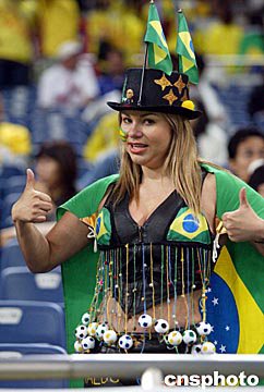 圖:巴西女球迷 2002年06月27日 16:49 ![]() 世界杯足球賽半決賽巴西隊(duì)對(duì)土耳其隊(duì)的比賽二十六日晚在日本琦玉縣世界杯體育場(chǎng)舉行,巴西隊(duì)以一比零取勝而進(jìn)入決賽。圖為現(xiàn)場(chǎng)助威的巴西球迷。作者:毛建軍