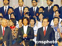 圖:江澤民登臺感謝全體演出人員 2002年07月01日 11:36 ![]() 7月1日上午,香港隆重舉行慶祝香港回歸祖國五周年大會暨特區(qū)第二屆政府就職典禮,國家主席江澤民登臺感謝全體演出人員。中新社傳真任晨鳴攝