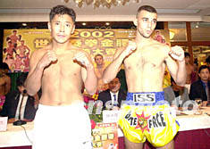 ![]() 2002世界泰拳金腰帶慈善大賽組委會(huì)十六日在澳門舉行新聞發(fā)布會(huì),綽號(hào)“草原雄鷹”的中國選手格日樂圖(左)和對手在會(huì)上亮相。李剛 攝