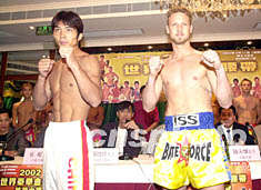 ![]() 2002世界泰拳金腰帶慈善大賽組委會(huì)十六日在澳門舉行新聞發(fā)布會(huì),綽號(hào)“怪俠三毛”的中國選手王三楨(左)在會(huì)上與對手共同亮相。李剛 攝