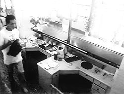 經(jīng)查,該男子曾幾次前往作案地點,第一次出現(xiàn)時身穿一件白色廣告衫,衣領(lǐng)為小V字領(lǐng),廣告衫底部有一黑色寬條紋。作案時犯罪嫌疑人身穿白色圓領(lǐng)廣告衫,胸前有人形圖案,下身穿淺藍色牛仔褲,戴寬邊金色金屬框架太陽眼鏡,隨身攜帶一黑底紅面尼龍拉鏈折迭包。