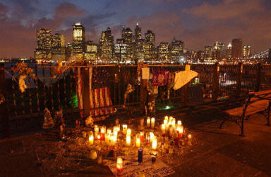 2001年9月20日,911恐怖事件發(fā)生一周后,紐約布魯克林區(qū)和曼哈頓中間的東河岸邊,擺滿了紀(jì)念死難者的蠟燭。(春風(fēng))