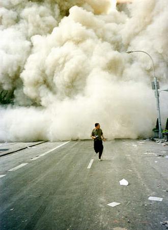 2001年9月11日,紐約世貿(mào)中心大樓倒塌后,一男子沿百老匯大街奔跑逃命,身后是大樓倒塌引起的煙塵。(春風(fēng))