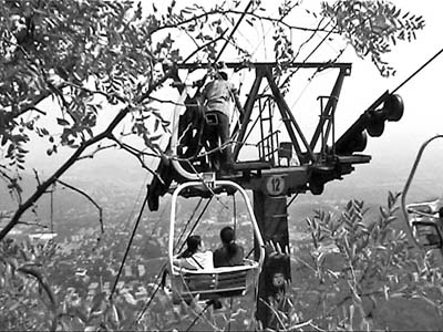 據(jù)了解,昨天中午12時20分左右,為香山公園布置監(jiān)控系統(tǒng)的北京機(jī)械科學(xué)研究院監(jiān)控工作室在布線過程中,因?yàn)槭┕び玫匿摾|卡住一輛纜車,造成纜車上一名游客跌落下來受傷,另一名游客吊在空中時被工作人員及時救下。事故發(fā)生在11到12支架之間,一度引起整個索道停運(yùn)。記者在現(xiàn)場看到,事故發(fā)生處的索道鋼纜纏成一團(tuán)亂麻,有工程人員站在鋼纜上將纏住的線剪斷。