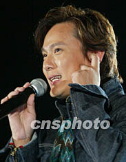 臺灣歌手張信哲十日晚在遼寧丹東市為2002年中國鴨綠江國際旅游節(jié)演唱助興。作者:趙振清