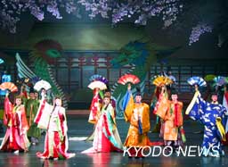 舞臺(tái)上的人物身穿和服,舒緩流暢的旋律中融入日本民間音樂,梆笛、尺八等民間樂器也時(shí)時(shí)出現(xiàn)。扮演雪若的女演員聲音低沉寬厚,把該劇悲傷委婉的情緒渲染得恰到好處,主題曲《櫻花盛開時(shí)》更是悠揚(yáng)動(dòng)聽。劇中的舞蹈日本民間味道十足,如果不是《梁山伯與祝英臺(tái)》的旋律幾次響起,觀眾肯定不知道它與中國(guó)傳說有關(guān)。