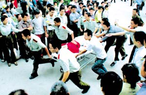 除了事發(fā)當(dāng)?shù)啬暇┙瓕巺^(qū)湯山鎮(zhèn)居民和救護(hù)人員之外,出租車司機(jī)是這座城市最先知道這一事件的人。昨天,在記者乘坐的每一輛出租車上,司機(jī)師傅都在不停地調(diào)選廣播電臺,希望盡快知道更多有關(guān)中毒事件的消息。南京中北出租汽車公司的一位司機(jī)說,如果可能,他愿意無償為救護(hù)工作服務(wù),“都是些孩子和民工兄弟呀”。