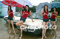 中國首批柴油轎車--捷達(dá)柴油環(huán)保轎車二十日在海南三亞舉行向市場投放儀式,新絲路模特大賽女選手雨中演出環(huán)保秀。環(huán)境優(yōu)美的三亞市率先在國內(nèi)推廣柴油環(huán)保轎車,以進(jìn)一步保護環(huán)境。作者:毛建軍