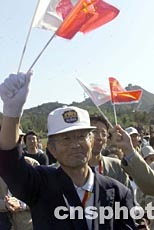 一位日本老人二十二日手舉中日兩國國旗在北京八達嶺長城腳下參加“中日友好萬人友誼林”植樹活動。這次活動是為紀念中日邦交正;苣甓e行的。作者:滿會喬