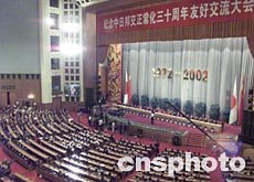 紀(jì)念中日邦交正;苣暧押媒涣鞔髸(huì)今晚在人民大會(huì)堂舉行。一萬(wàn)三千余名日本來(lái)賓會(huì)聚于此,與中方各界人士共同紀(jì)念這個(gè)對(duì)兩國(guó)人民都具有重要意義的日子。會(huì)上,江澤民主席代表中國(guó)政府和人民并以他個(gè)人的名義對(duì)這次活動(dòng)的成功舉辦表示祝賀,向參加活動(dòng)的各位日本朋友表示歡迎。