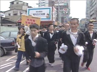 中新網(wǎng)9月29日電 臺(tái)中市28日有一場(chǎng)馬拉松比賽,參賽者比一般選手更辛苦,因?yàn)樗麄儽仨毮7掠靶浅升堅(jiān)谛缕械脑煨,大熱天里身穿燕尾服跑一段路,還要將漏氣的腳踏車輪胎打滿氣,再騎著腳踏車到終點(diǎn),才能成為贏家。