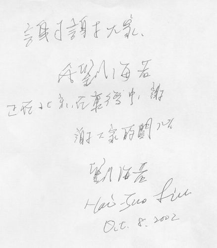 進(jìn)入10月以來,海若已能夠用文字表達(dá)自己的感情。在一張紙上,海若寫道:“謝謝大家。我是劉海若,正在北京康復(fù)中。謝謝大家的關(guān)心!辈⒂弥杏⑽膶懴伦约旱拿。在另一張紙上,海若寫道:“很想念大家,希望大家幸?鞓。我很快回到工作崗位和大家見面。聽說小莉要生寶寶了,祝她們健康幸福!