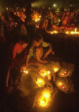 10月14日,在巴厘島的外國兒童點燃蠟燭為爆炸中的受害者祈禱。