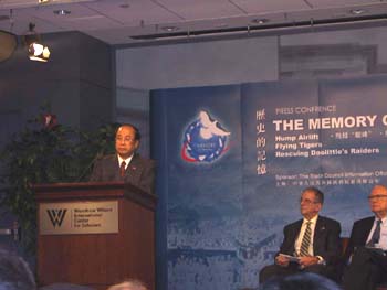 這是今天在此間開幕的大型展覽“歷史的記憶”的重要活動之一。在中美聯(lián)合公報發(fā)表三十周年,江澤民主席即將訪美之際,中國國務(wù)院新聞辦在此間的威爾遜中心舉辦“歷史的記憶”展覽,該展覽分為“駝峰航線”、“陳納德和美國志愿航空隊”、“營救杜利特爾轟炸機(jī)隊”三部分,講述“二戰(zhàn)”期間中美在反法西斯戰(zhàn)爭中的合作歷史。