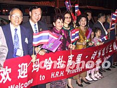 專程從泰王國飛抵海口迎接詩琳通公主的一百多名泰國海南鄉(xiāng)親,在機(jī)場拉起了寫著泰文與中文的橫幅,揮舞著中國、泰國國旗,在十五的滿月下笑迎詩琳通公主。