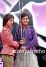 香港英皇集團(tuán)旗下當(dāng)紅明星Twins, 10月21日在啟德舊機(jī)場(chǎng)《千機(jī)變》電影記者會(huì)上手持除妖斬魔劍為新片作造型。洪少葵 攝