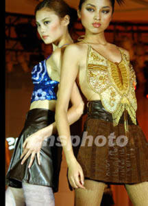 2002年中國義烏國際小商品博覽會(huì)日前在浙江義烏市舉行,中外客商云集、精品薈萃,中國著名襪業(yè)品牌“夢(mèng)娜”有限公司在博覽會(huì)上推出中國首場腿部時(shí)裝秀。圖為模特向中外客商展示精美襪裝。作者:錢興強(qiáng)