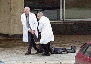 10月24日,在莫斯科軸承廠文化宮劫持數(shù)百名人質(zhì)的車臣武裝分子槍殺一名女性人質(zhì)。圖為兩名醫(yī)務(wù)人員移走被車臣武裝分子槍殺的女子尸體。