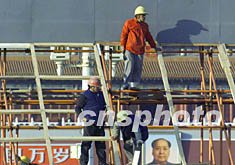 北京工人們十月底在天安門(mén)廣場(chǎng)安裝大型字牌,準(zhǔn)備迎接中共十六大的召開(kāi)。作者:滿會(huì)喬