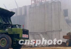 江水奔騰,浪花飛卷。導(dǎo)流明渠右岸數(shù)百臺(tái)大型運(yùn)載車,不斷地將一車車石料傾人江中。