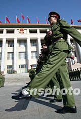 一隊解放軍戰(zhàn)士四日在北京人民大會堂前進行隊列練習,迎接即將召開的中國共產(chǎn)黨第十六次全國代表大會。作者:毛建軍