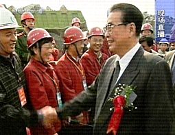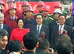 三峽工程導(dǎo)流明渠截流今天上午合龍成功。截流儀式結(jié)束后,中共中央政治局常委、全國(guó)人大常委會(huì)委員長(zhǎng)李鵬,中共中央政治局委員、國(guó)務(wù)院副總理吳邦國(guó),全國(guó)人大常委會(huì)副委員長(zhǎng)鄒家華等中央領(lǐng)導(dǎo)離開主席臺(tái),到上游圍堰接見三峽建設(shè)者。