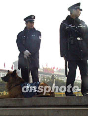 十一月六日,在中共十六大代表陸續(xù)抵達(dá)北京時(shí),北京天安門通過地下通道進(jìn)入廣場(chǎng)的人員都需通過警犬檢查。作者:廖文靜