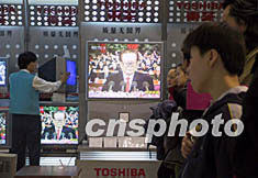 中共十六大十一月八日清晨在北京開幕,北京市民在商場(chǎng)觀看開幕式。張宇 攝