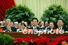 朱镕基、胡錦濤和李嵐清八日在北京中共十六大的主席臺上出席開幕式。作者:毛建軍