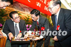 十六大代表、中共中央政治局常委李鵬九日與重慶代表一起討論十六大報告。會后,吳康明代表(右二)拿出一本影集,介紹由李鵬捐款資助的學(xué)生的學(xué)習(xí)與生活情況。作者:毛建軍