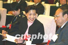來(lái)自北京公交系統(tǒng)的十六大代表李素麗,在北京代表團(tuán)分組會(huì)上與代表一起討論十六大報(bào)告。著名勞動(dòng)模范李素麗曾是巴士車上的一名普通售票員,現(xiàn)在主持“公交李素麗服務(wù)熱線”工作。作者:毛建軍