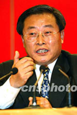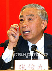 中華全國總工會副主席張俊九和中國社會勞動保障部部長張左已十一日在中共十六大新聞中心舉行新聞發(fā)布會。張俊九回答記者提問。毛建軍 攝
