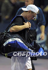 上海十三日晚結(jié)束的大師杯小組賽可謂冷門迭起,繼阿加西慘敗后,頭號(hào)種子休伊特又以0比2輸給了狀態(tài)正佳的西班牙老將莫亞,小組出線形勢(shì)不容樂觀。圖為休伊特賽后黯然離場。作者:湯彥俊
