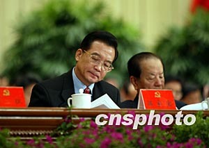溫家寶十四日在北京出席中共十六大的閉幕會。作者:毛建軍