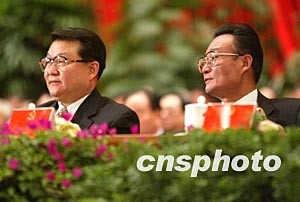 賈慶林和黃菊十四日在北京出席中共十六大的閉幕會。作者:毛建軍