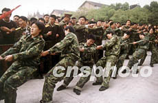 以培養(yǎng)解放軍各級政治干部的南京政治學院,女兵們在初冬的周末進行拔河比賽,眾多男兵為她們吶喊助威。作者:王興會