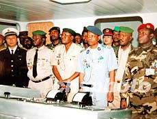 國防大學外訓系高級指揮班三十四名外籍軍官二十一日訪問廣州艦艇學院。圖為外籍軍官在該院副院長李寧將軍陪同下參觀艦艇教學模擬訓練中心。作者:庹新國