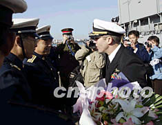 24日上午10時(shí)許,美國海軍“福斯特”號(hào)在艦長約翰·尼高中校的率領(lǐng)下,徐徐駛?cè)肭鄭u港,開始對(duì)青島進(jìn)行為期5天的友好訪問。隨艦來訪官兵共353人,其中軍官26人,水兵327人。圖為北海艦隊(duì)官兵迎接福斯特號(hào)艦長。作者:王松岐