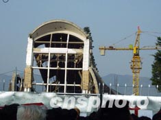 落成于一九五九年的福州火車站大樓二十五日實(shí)施爆破拆除失敗,五個(gè)相連接的拱形建筑被炸掉四個(gè)。煙塵散去,大樓的一部分仍巍然屹立,立柱上埋入的炸藥沒有引爆。作者:華小銳