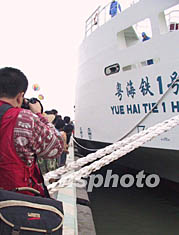 中國第一艘跨海火車輪渡“粵海鐵一號”,25日上午已經(jīng)停泊在粵海鐵路通道南港防波堤外,預(yù)計下午進入南港開始與船、橋、港對接。海南百姓聚集在碼頭上等待粵海鐵一號與海南土地的第一次親密接觸。作者:關(guān)向東