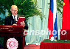 普京總統(tǒng)的演講從上午十一時(shí)十二分開(kāi)始,為時(shí)五十分鐘。在普京演講前,江澤民主席作了五分鐘的講話。