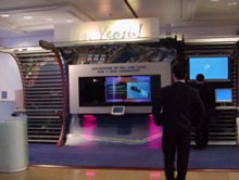 在中國的展臺,外層設(shè)有照相機鏡框形狀的白色門框,蘊涵“聚焦”之意。在門框上,還做成了一個激光豎琴,手指撥動激光束便能聽到動聽的旋律。今天一位中國姑娘將在這里演奏中國申博宣傳片的主題曲———《好一朵美麗的茉莉花》。