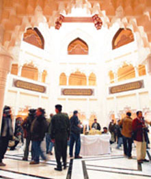 這個(gè)名為“蘇朱德”的薩達(dá)姆官邸占地面積龐大,裝飾著精美圖案的厚重鐵門(mén)正對(duì)著官邸主樓。在通向主樓的柏油路兩邊是開(kāi)滿(mǎn)鮮花的花園和碧綠的草坪。這個(gè)三層高的拱型建筑內(nèi)部裝修豪華氣派,在八面體的墻上都雕刻著贊美薩達(dá)姆的詩(shī)句。天花板上垂下來(lái)巨大的枝型水晶吊燈。大廳旁邊還擺放著一張長(zhǎng)方形的大餐桌。