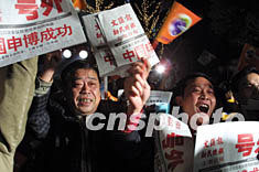 三日晚,在摩納哥夢特卡洛舉行的國際展覽局第132次會議上,中國上海通過激烈竟爭獲得2010年世界博覽會主辦權,當中國申博成功的喜訊從蒙特卡洛傳來的時候,上海全城沉浸在一片歡樂之中。圖為申城市民在為中國申博成功歡呼。作者:湯彥俊